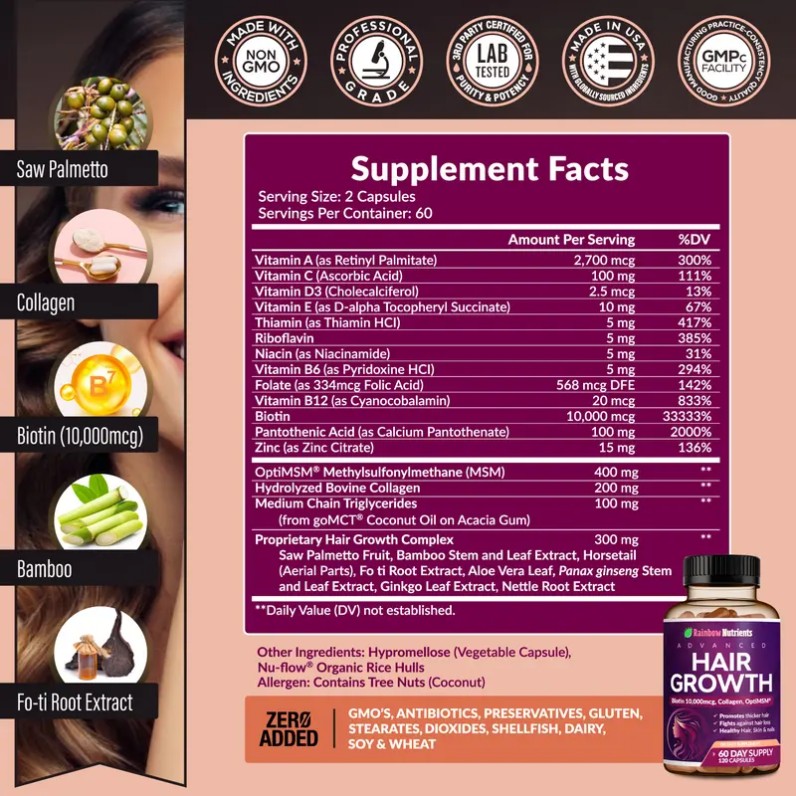 This Advanced Hair Growth Vitamins formula is perfect for anyone looking to promote thicker hair, prevent hair loss, and support skin and nail health. With 60 capsules, you have a convenient supply for daily use.